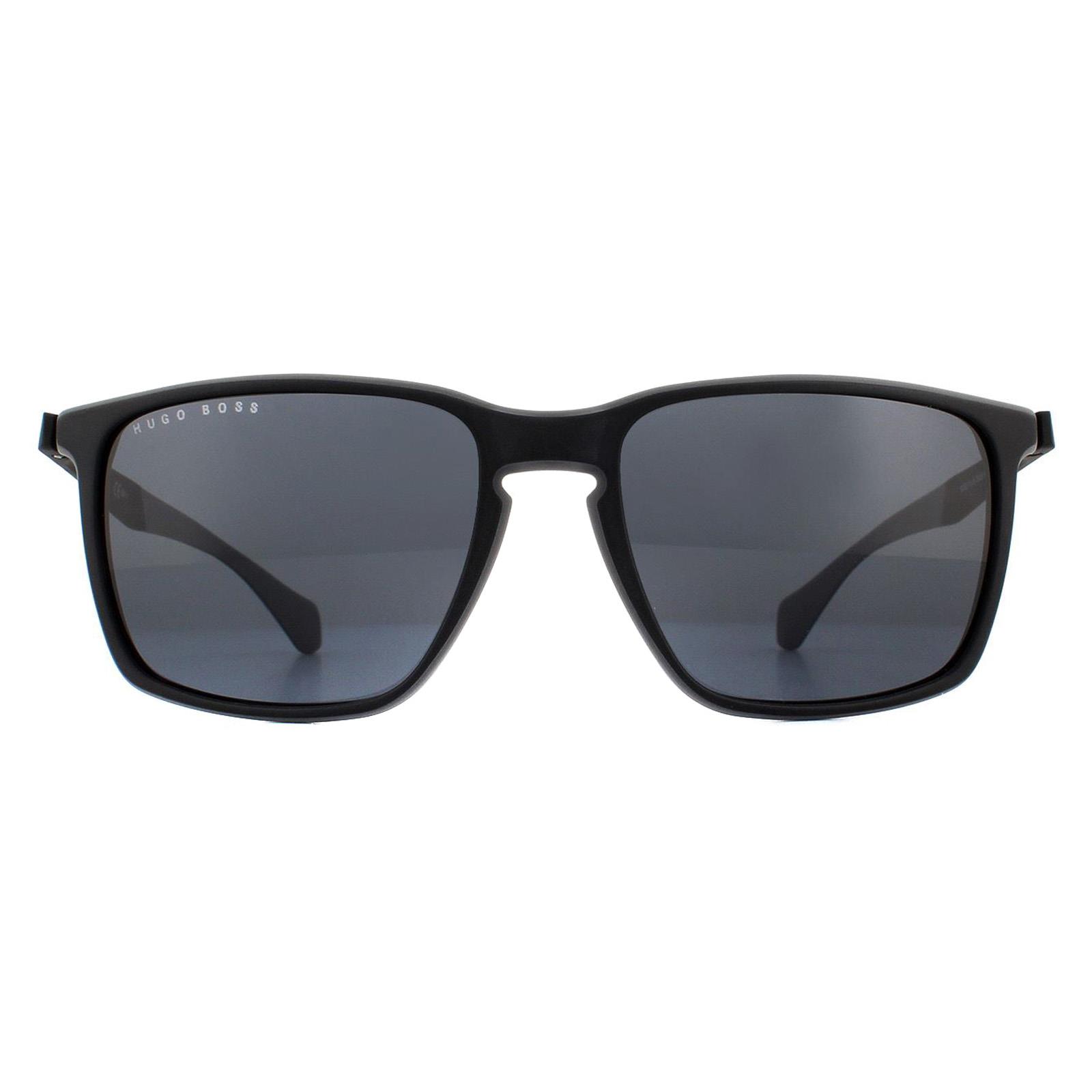 Hugo Boss Sunglasses 1114/S O6W IR Dark Grey Grey are a classic and versatile rectangular style made entirely of lightweight plastic. The outer edge of the frame front is coloured to match the Hugo Boss lettering on the temples and the inside of the temple tips.