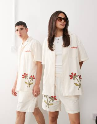 Shirts by Reclaimed Vintage Exclusive to ASOS Revere collar Button placket Chest pocket Logo embroidery Floral detailing Relaxed fit Unisex style