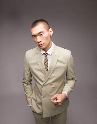 Topman slim double breasted suit jacket in light khaki-Green