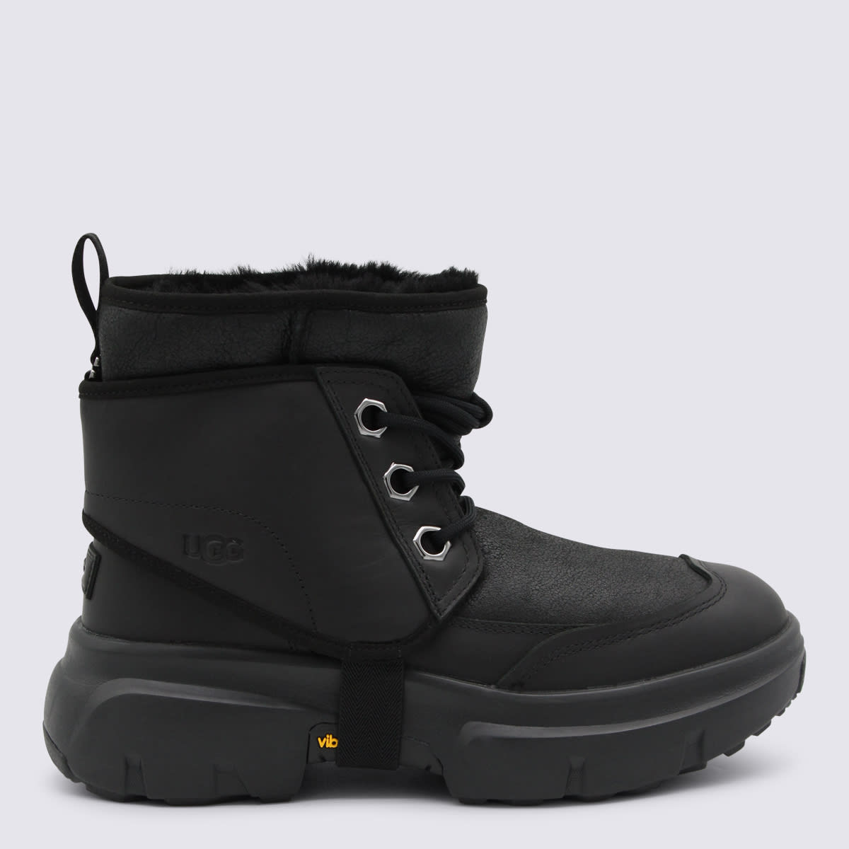 Black boots from UGG featuring round toe, lace up fastening, slip on style and rubber sole.Composition: Sole El Cover, 43% Cotton, 26% Le, 20% Polyurethane, 6% Polyester, 5% Viscose